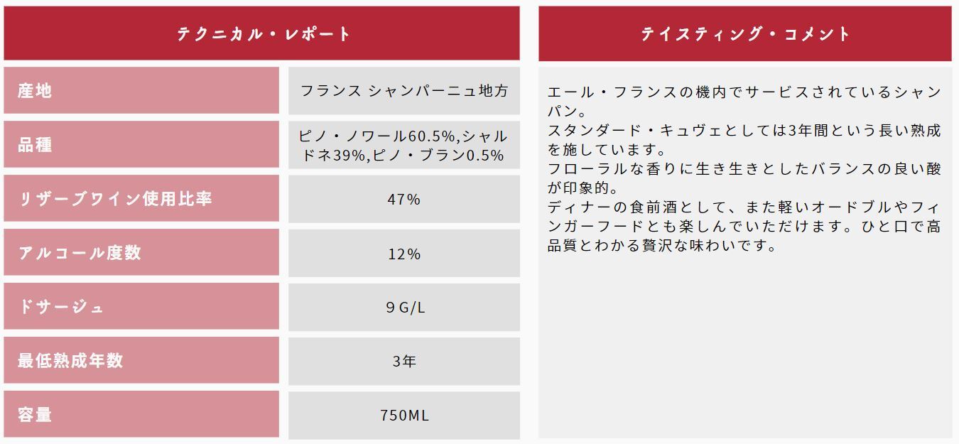 スタンダード・キュヴェとしては3年間という長い熟成を施し、リンゴを思わせる香りに厚みのある飲み応え。そしてハチミツや白い花を思わせる長い余韻は、ひと口で高品質とわかる贅沢な味わいです。